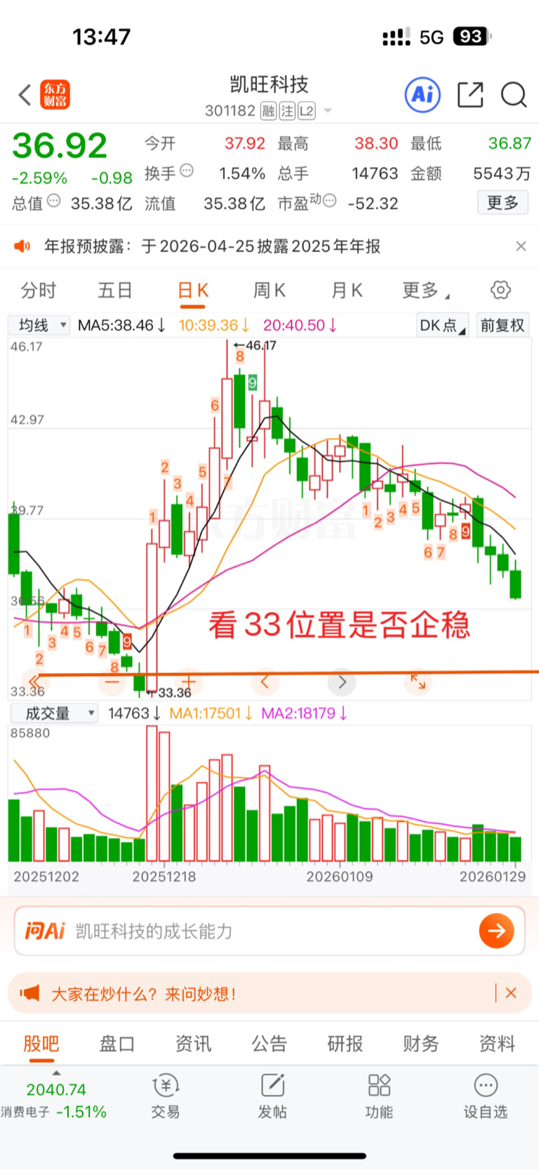 $凯旺科技(SZ301182)$ 一直在5日线下的股票,就是大跌趋势,稍微炒股俩年半的都应该清楚,这种走势肯定奔着33去的,年前应该会到33,年后如果大盘板块回调,它应该会跌破30。帖子永远都在,到时候我可以转发翻出来。