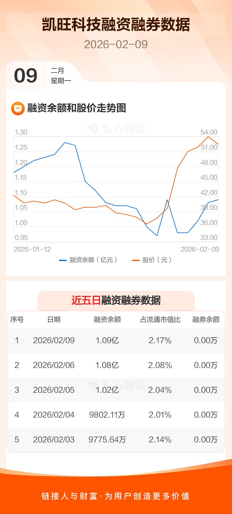 交易所最新数据显示,凯旺科技于2026年2月9日获融资买入4421.77万元,融资偿还4262.16万元,当日融资净买入159.61万元。目前,该股融资余额1.09亿,占流通市值比例为2.17%。
