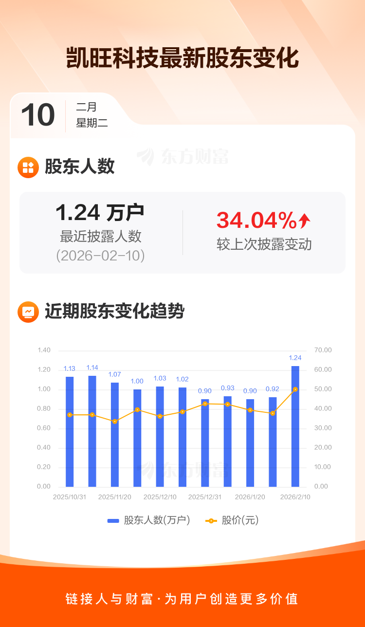 凯旺科技:截至2月10日最新股东户数1.24万户,较上期增加34.04%
