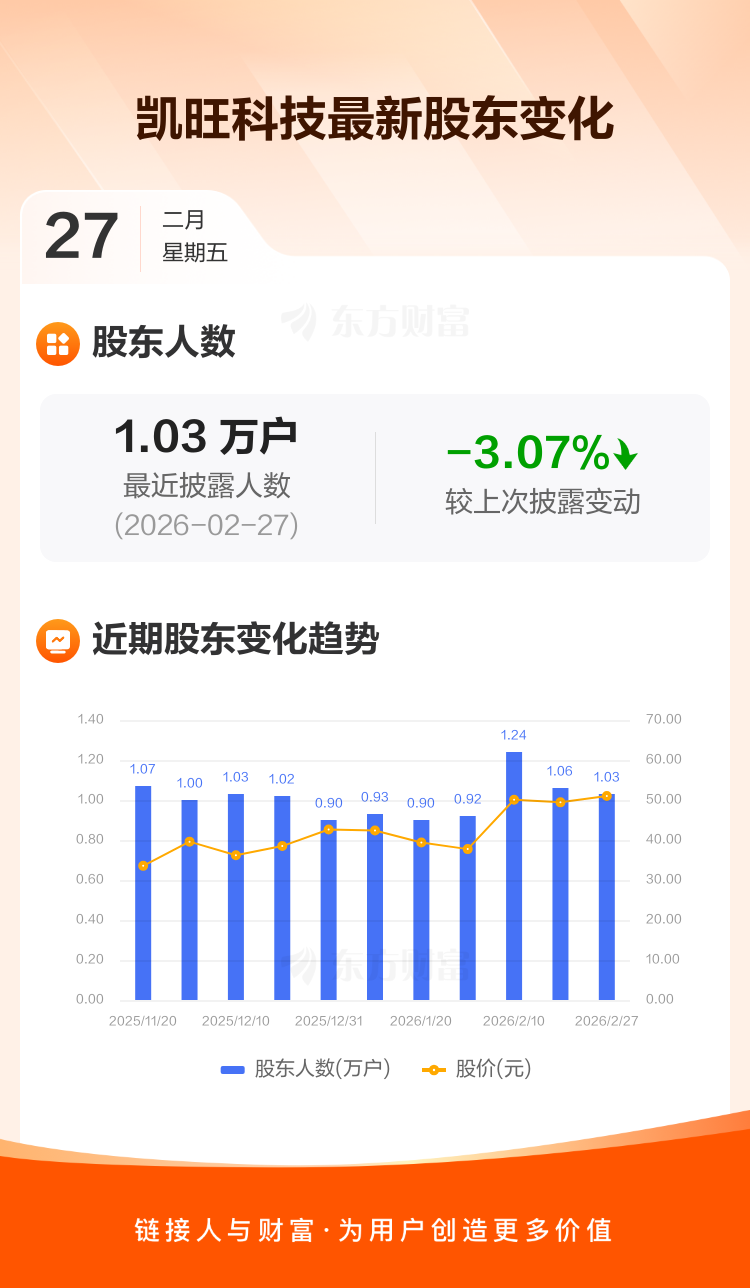 凯旺科技:截至2月27日最新股东户数1.03万户,较上期减少3.07%