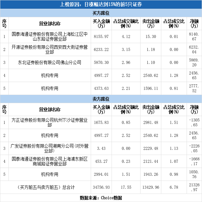 龙虎榜数据显示,今日共4个机构席位出现在龙虎榜单上,分别位列买四、买五、卖二、卖五,合计净买入6284.92万元,占龙虎榜净买额的29.47%。除此之外还有新金路、南网数字、榕基软件等24只个股榜单上出现了机构的身影,其中15家呈现机构净买入,获净买入最多的是新金路,净买额为1.20亿元;9家呈现机构净卖出,其中遭净卖出最高的为榕基软件,净卖额为1.03亿元。