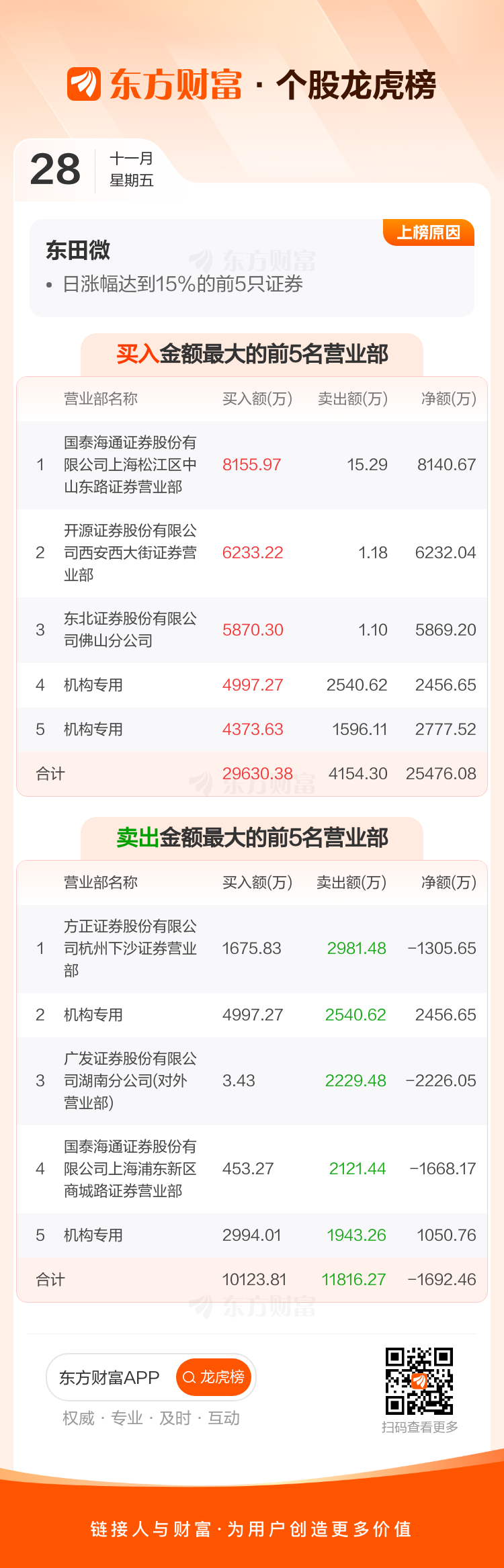 交易所2025年11月28日公布的交易公开信息显示,东田微因成为日涨幅达到15%的前5只证券上榜。东田微当日收报122.22元,涨跌幅20.00%,偏离值20.00%,换手率29.00%,成交额19.80亿。