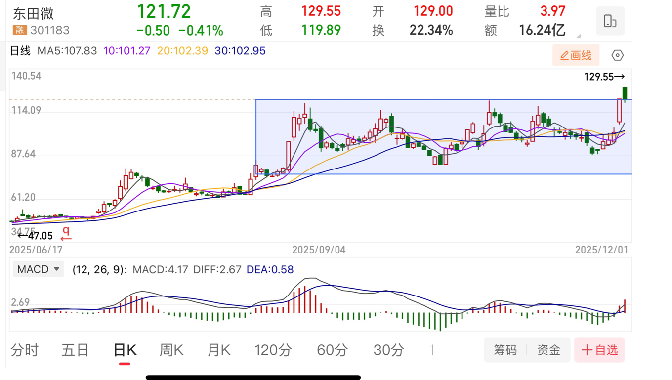 $东田微(SZ301183)$ 到达顶部了,明显的箱体震荡,跌下去才有可能再上涨