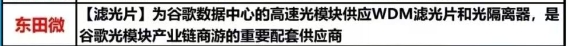东田微:为谷歌数据中心的高速光模块供应WDM滤光片和光隔离器,是谷歌光模块产业链