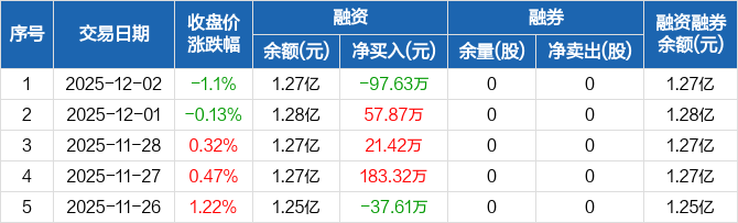超达装备:融资净偿还97.63万元,融资余额1.27亿元(12-02)