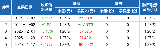 超达装备:融资净买入65.98万元,融资余额1.27亿元(12-03)
