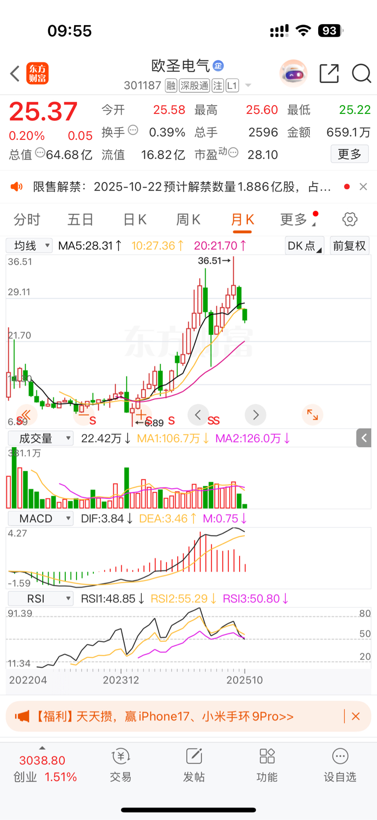 $欧圣电气(SZ301187)$ 从月线看,应该要跌到21.7元的!