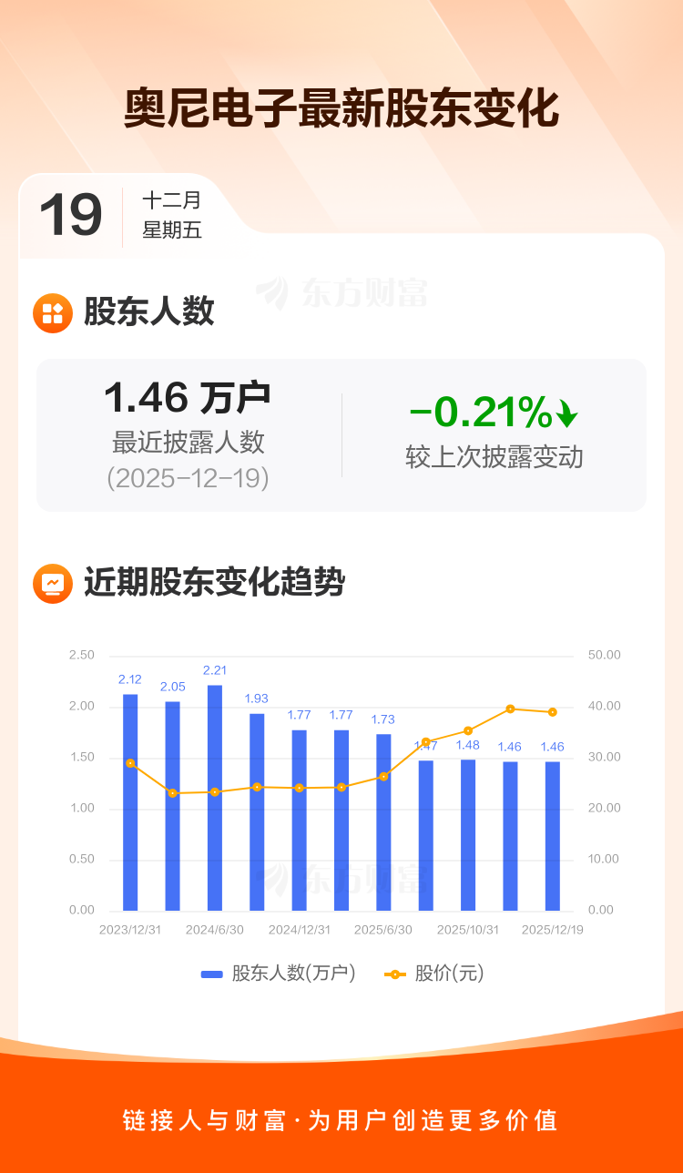 奥尼电子:截至12月19日最新股东户数1.46万户,较上期减少0.21%