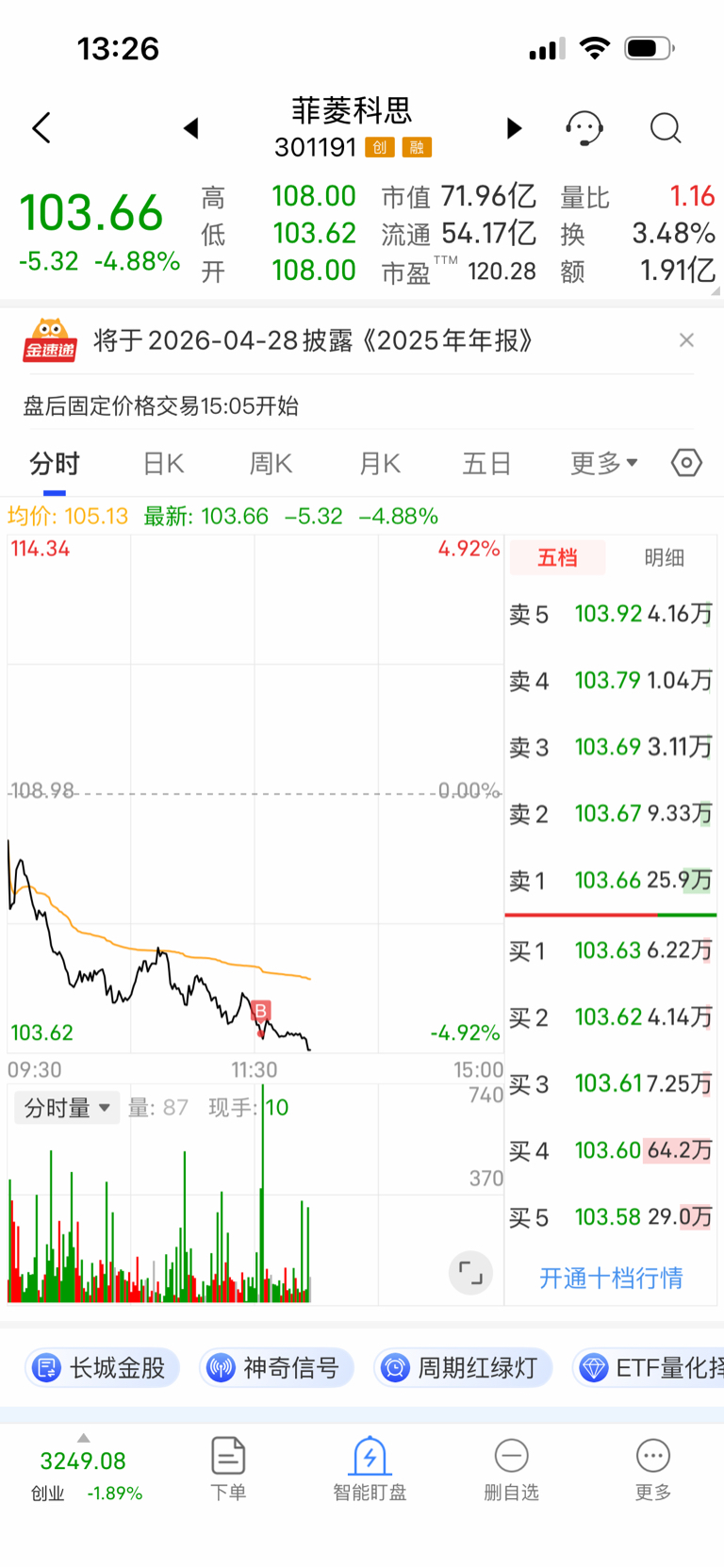 $菲菱科思(SZ301191)$ 以为104元到底不,没想到还有更低位,唉,要死人了。