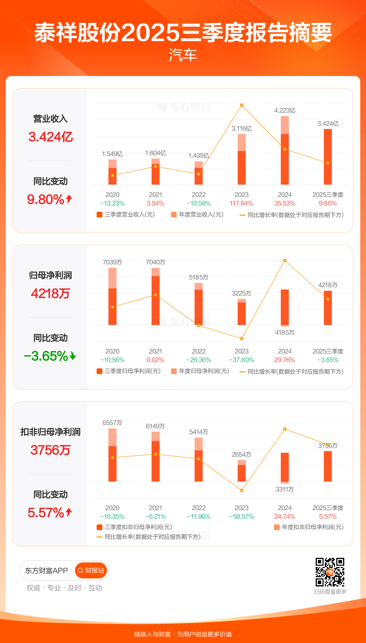 泰祥股份10月29日发布2025年三季报显示,公司前三季实现营业收入3.42亿元,同比增长9.80%;归母净利润4217.57万元,同比下滑3.65%;扣非归母净利润3756.42万元,同比增长5.57%。