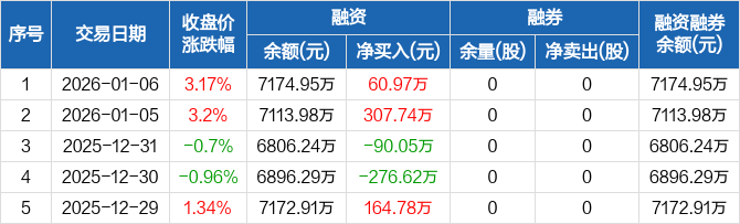 泰祥股份:融资净买入60.97万元,融资余额7174.95万元(01-06)