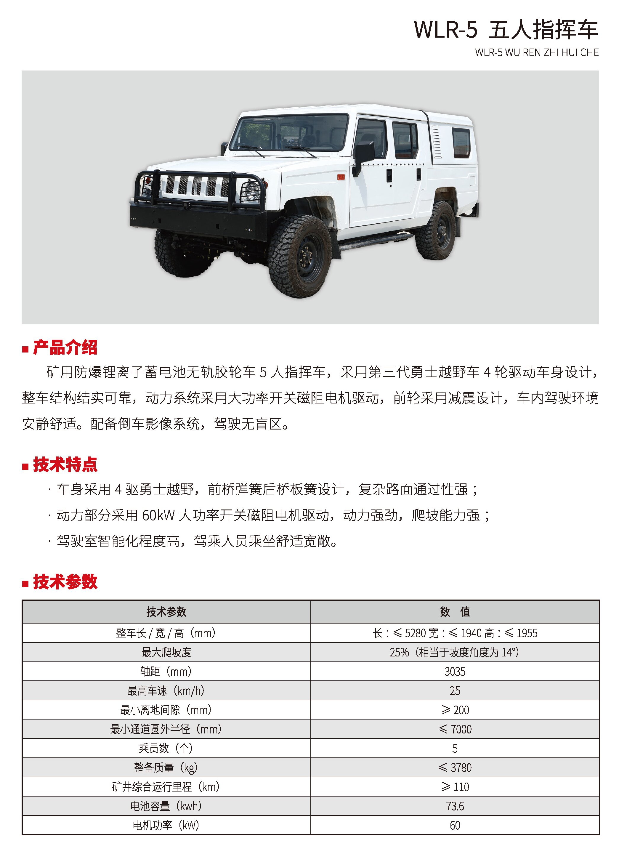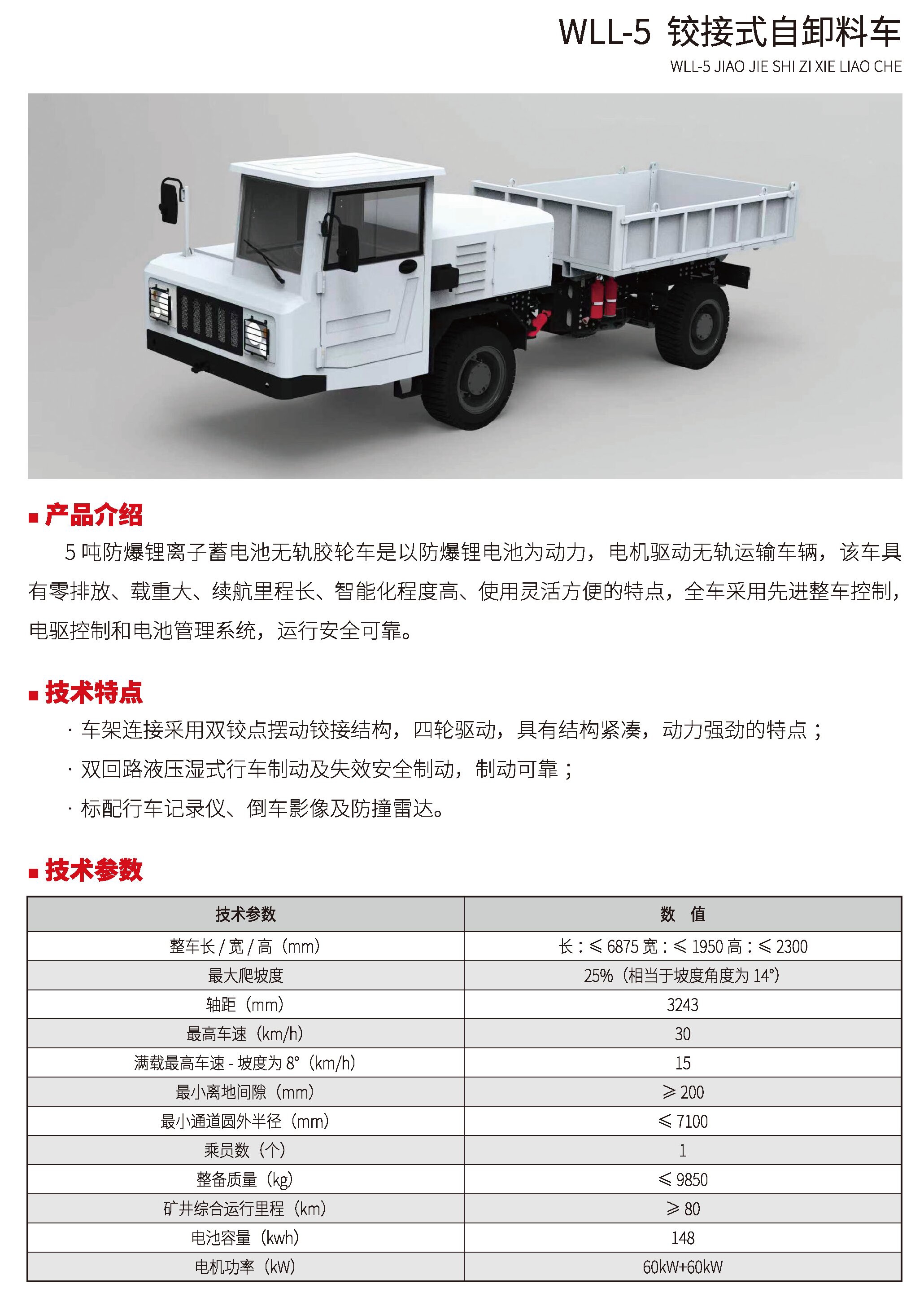 WLL-5这个型号是一款5吨级的、以锂电池为动力的无轨胶轮车。WLR系列:字母"R"通常指人车,用于运送人员。例如,WLR-5是5座指挥车,型号变体:有时会在基础型号后增加字母以示区别,例如WLL-5A或WLL-5E。