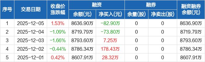北路智控:融资净偿还82.9万元,融资余额8636.9万元(12-05)