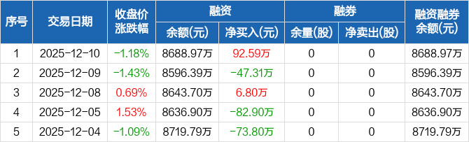 北路智控:融资净买入92.59万元,融资余额8688.97万元(12-10)