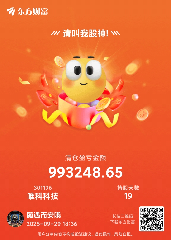 $唯科科技(SZ301196)$ 前几天卸了杠杆,从融资盘过来。今日已经清仓。留下的发财