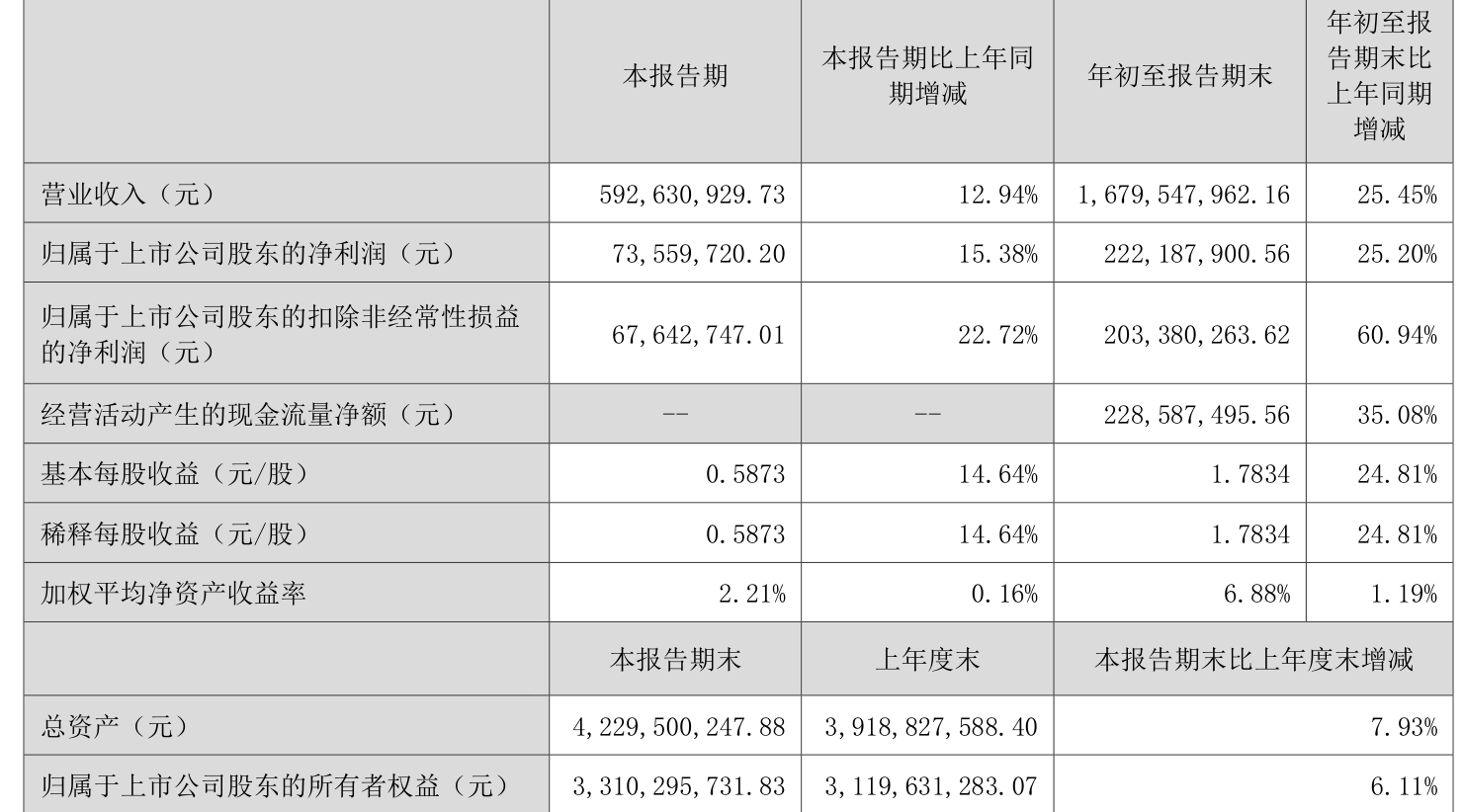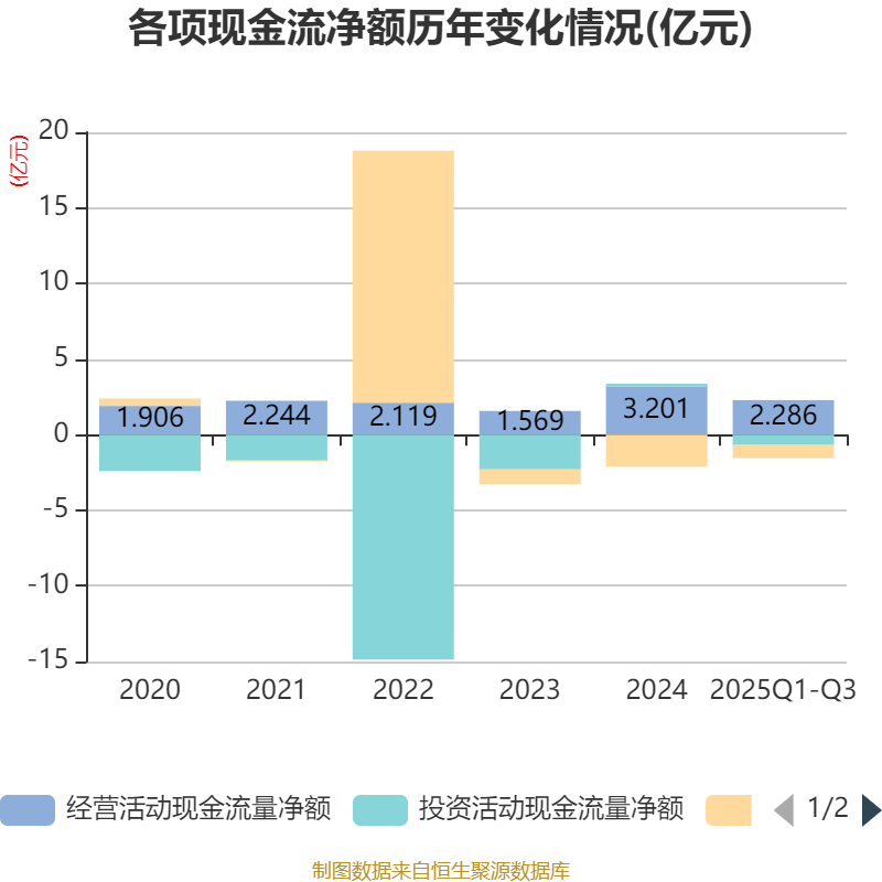 2025年前三季度,公司经营活动现金流净额为2.29亿元,同比增长35.08%;筹资活动现金流净额-8679.18万元,同比增加1.23亿元;投资活动现金流净额-6790.51万元,上年同期为9664.59万元。