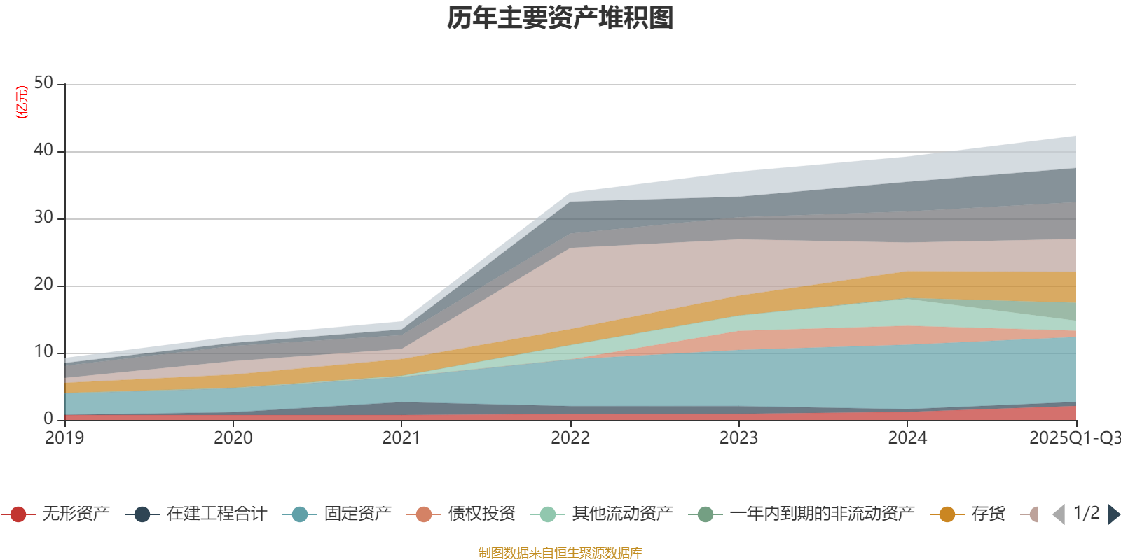 资产重大变化方面,截至2025年三季度末,公司其他流动资产较上年末减少63.21%,占公司总资产比重下降6.72个百分点;一年内到期的非流动资产较上年末增加1674.94%,占公司总资产比重上升5.95个百分点;债权投资较上年末减少66.71%,占公司总资产比重下降4.98个百分点;无形资产较上年末增加75.32%,占公司总资产比重上升1.89个百分点。