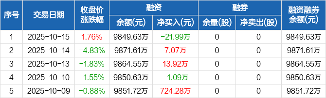 迈赫股份:融资净偿还21.99万元,融资余额9849.63万元(10-15)