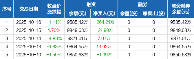 迈赫股份:融资净偿还264.21万元,融资余额9585.42万元(10-16)