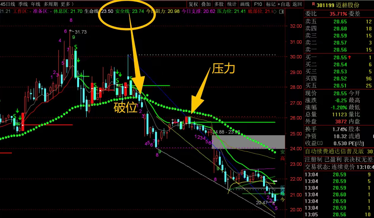 $迈赫股份(SZ301199)$ 近期趋势走得比较弱,前期高位回落跌破安全线之后,没有马上拉起来站稳,形成了破位走势,随后一直回落到现在,所以破位确认的时候就应该大幅减仓应对,不然拿到现在很被动。目前来看,依旧是下降趋势,没有必要参与,管住手。#复盘记录# #炒股日记#