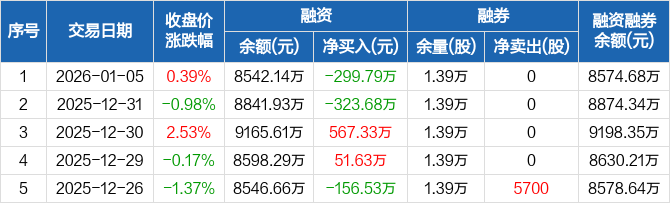 迈赫股份:融资净偿还299.79万元,融资余额8542.14万元(01-05)