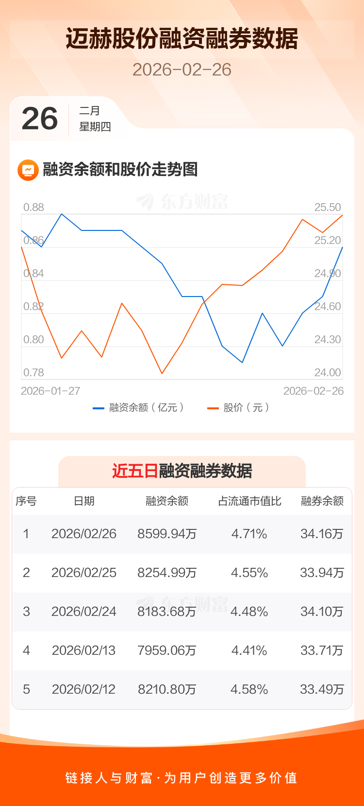 交易所最新数据显示,迈赫股份于2026年2月26日获融资买入828.80万元,融资偿还483.86万元,当日融资净买入344.94万元。目前,该股融资余额8599.94万,占流通市值比例为4.71%。
