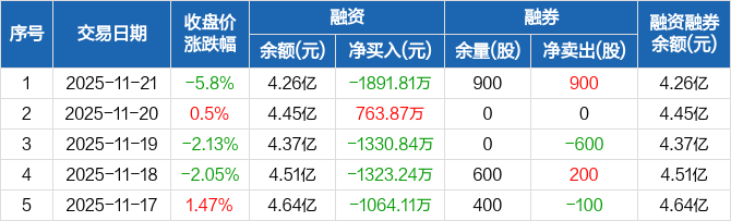 融资方面,当日融资买入2087.8万元,融资偿还3979.61万元,融资净偿还1891.81万元。融券方面,融券卖出900股,融券偿还0股,融券余量900股,融券余额9.49万元。融资融券余额合计4.26亿元。