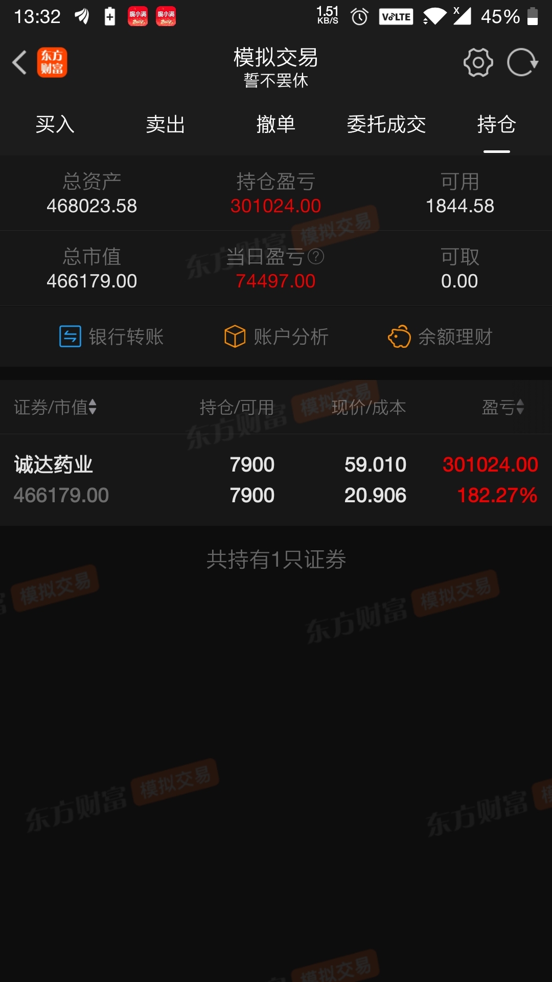 $诚达药业(SZ301201)$ 虽然是虚拟盘,但还是感谢诚达药业!100万资金亏得只剩16万多,买入诚达不到半年又回到了46万多,净赚30万多。我相信用不了一年,我可以回到100万!