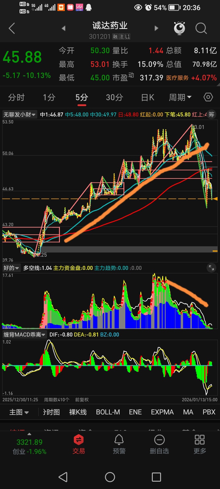 虽然下跌了,不舒服。但学会了5分钟级别主力底仓与股价背驰找卖点,也是值了