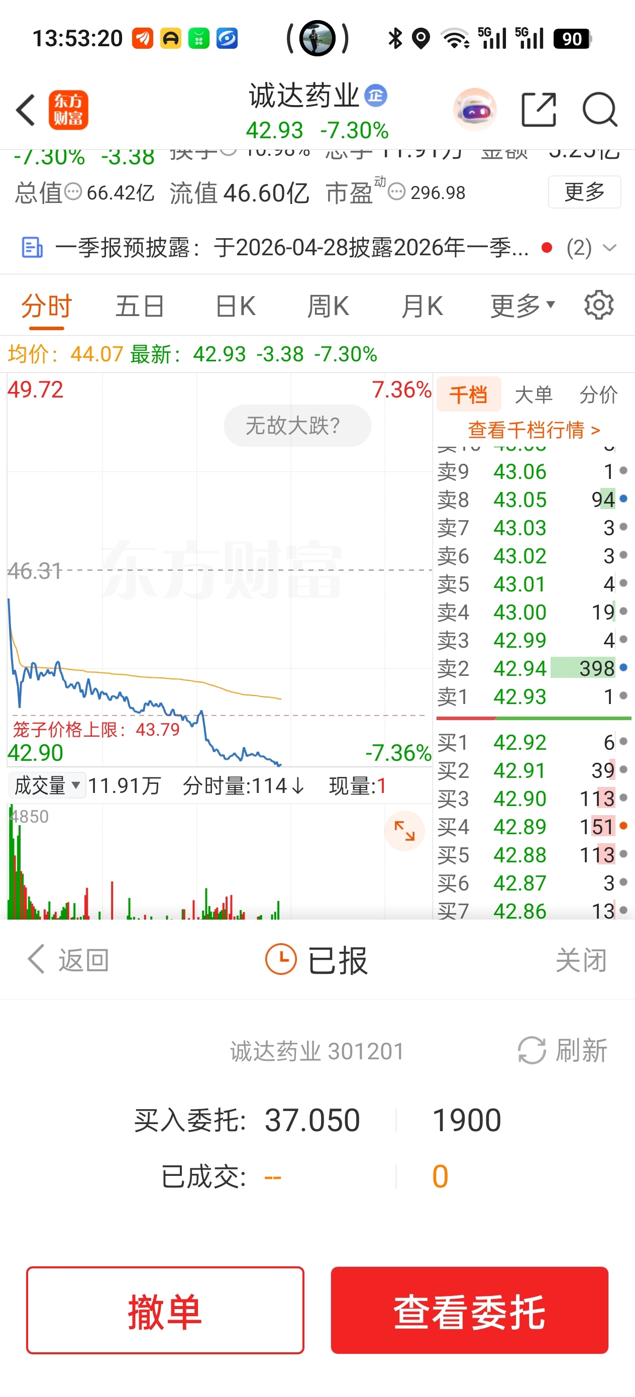 $诚达药业(SZ301201)$ 没打算补仓,,千万别成交。。。我只想让买单看起来多一点。。。给我涨