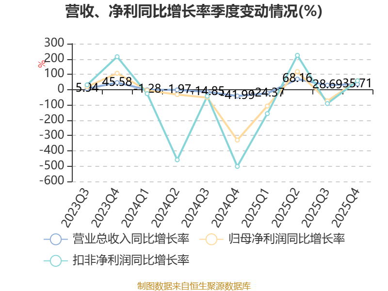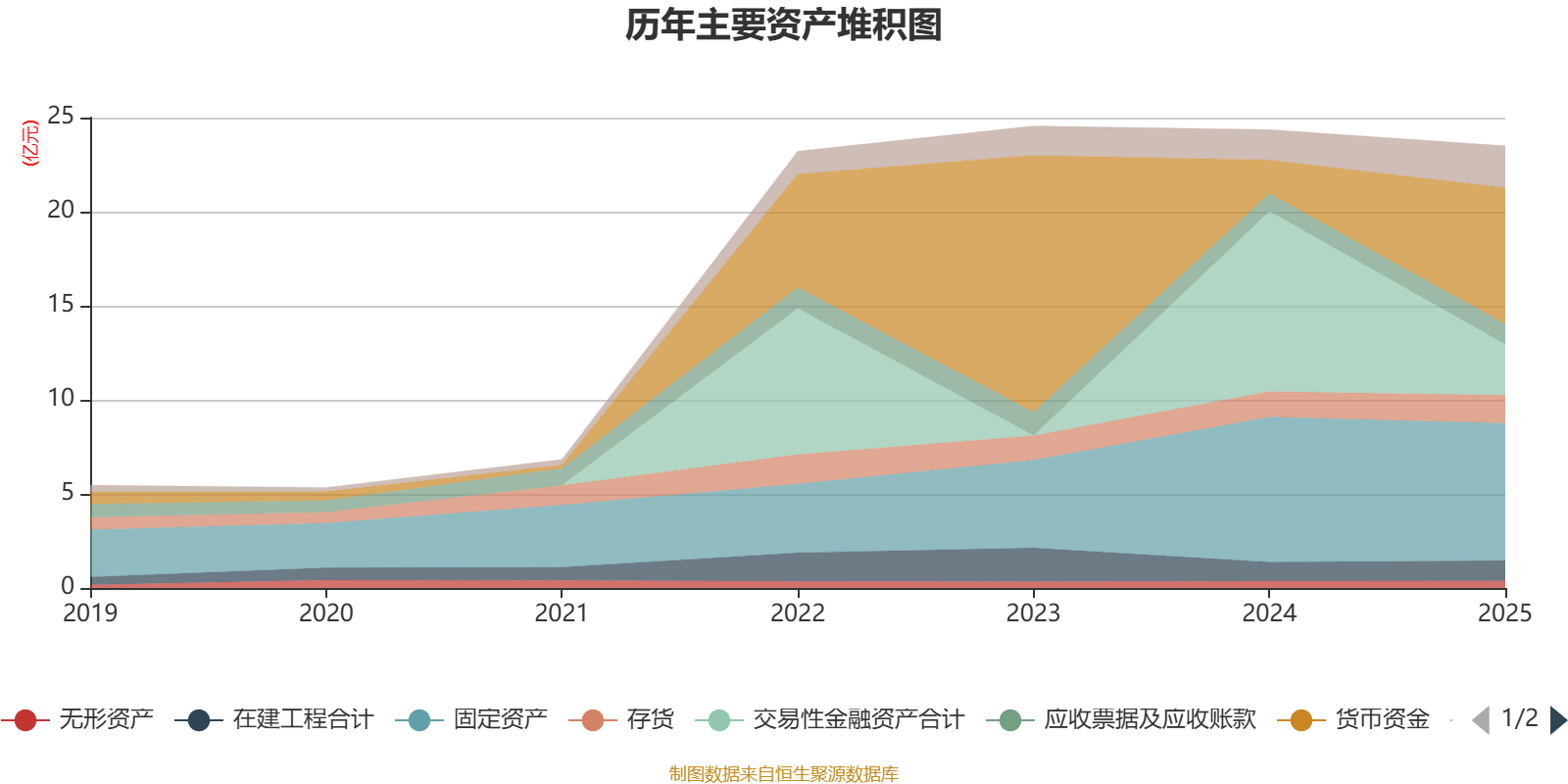 资产重大变化方面,截至2025年末,公司交易性金融资产合计较上年末减少71.8%,占公司总资产比重下降27.81个百分点;货币资金较上年末增加306.7%,占公司总资产比重上升23.56个百分点;长期股权投资占公司总资产的2.91%,上年末为0;存货较上年末增加9.73%,占公司总资产比重上升0.76个百分点。