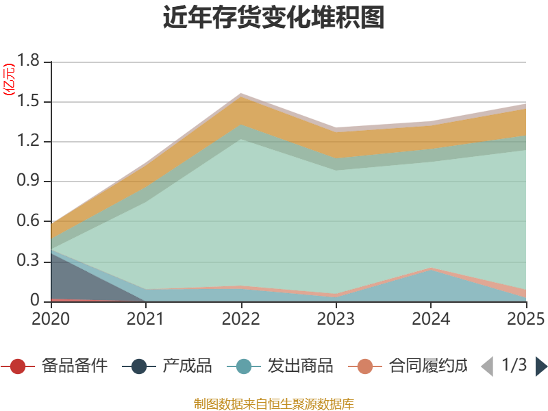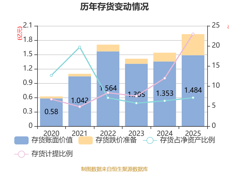 从存货变动来看,截至2025年末,公司存货账面价值为1.48亿元,占净资产的7.09%,较上年末增加1316.22万元。其中,存货跌价准备为4421.25万元,计提比例为22.95%。