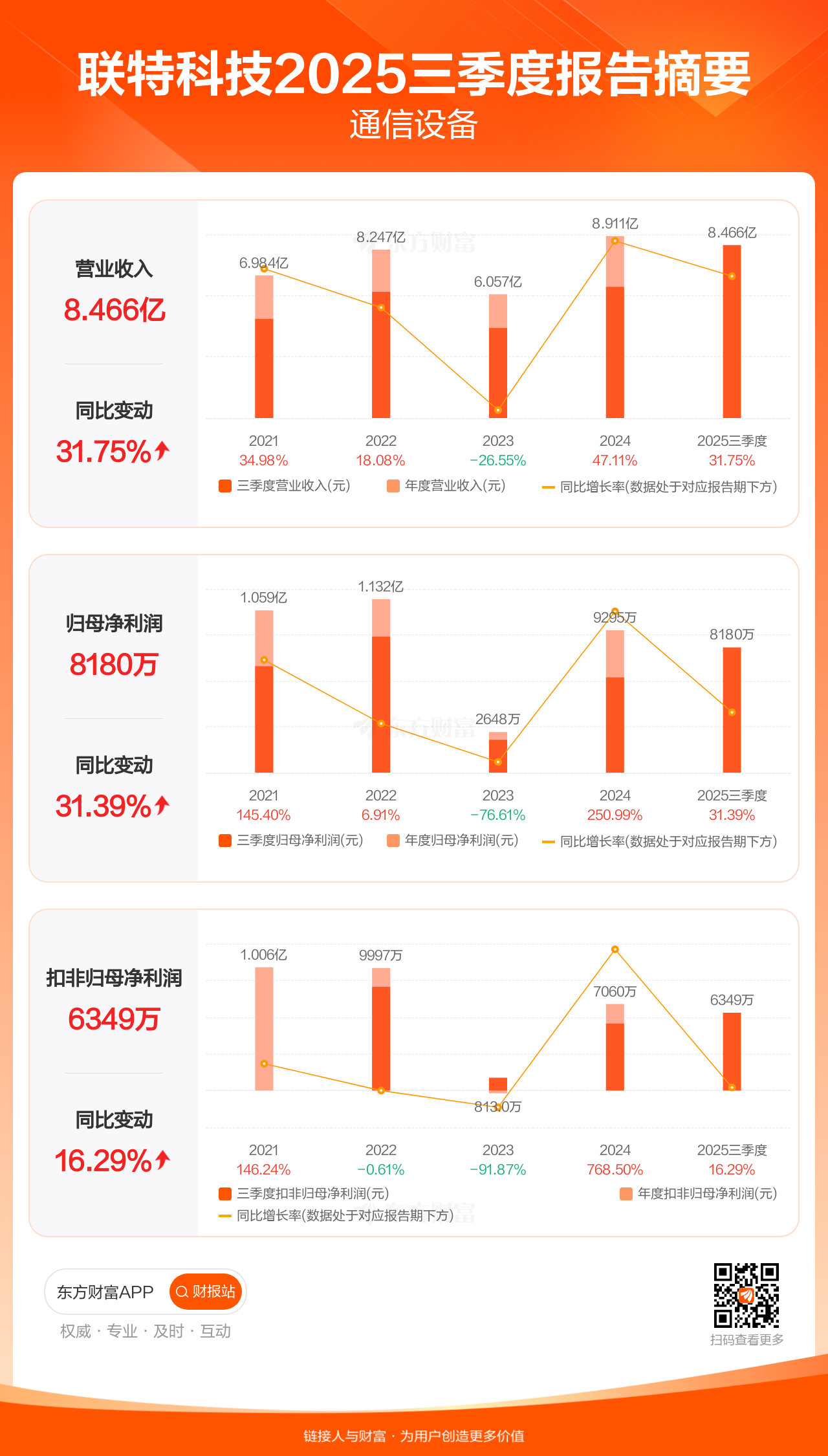 联特科技10月29日发布2025年三季报显示,公司前三季实现营业收入8.47亿元,同比增长31.75%;归母净利润8179.59万元,同比增长31.39%;扣非归母净利润6349.18万元,同比增长16.29%。