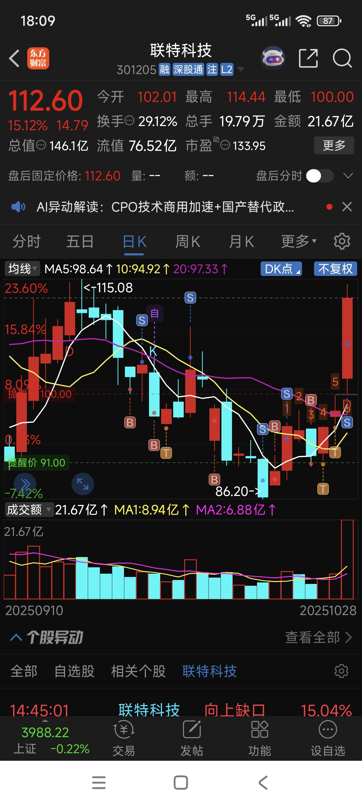 做T后一直到成本81.3,盈利30点,上午看看涨那么多,同板块个股都在回调107