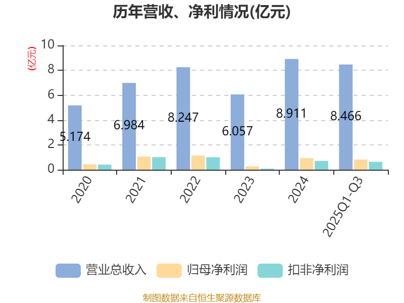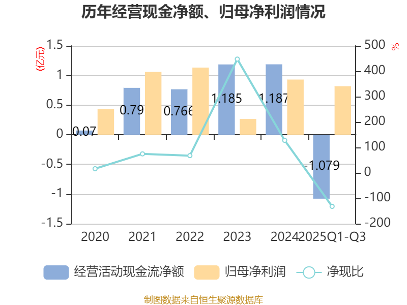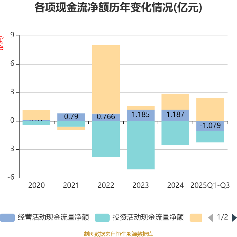 2025年前三季度,公司经营活动现金流净额为-1.08亿元,同比减少1.57亿元;筹资活动现金流净额2.4亿元,同比增加1.31亿元;投资活动现金流净额-1.19亿元,上年同期为-8454.5万元。