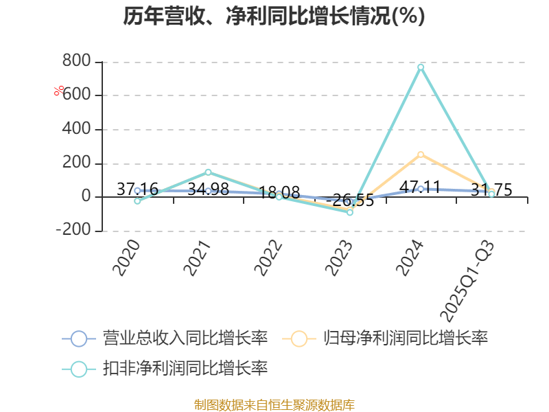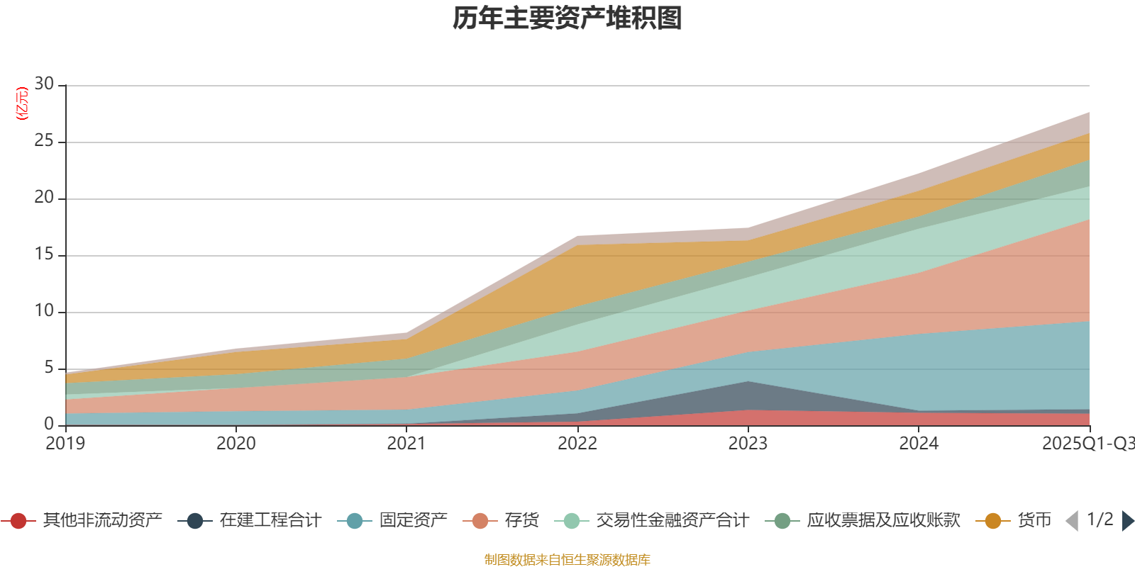 资产重大变化方面,截至2025年三季度末,公司存货较上年末增加66.47%,占公司总资产比重上升8.23个百分点;交易性金融资产合计较上年末减少24.95%,占公司总资产比重下降6.93个百分点;应收票据及应收账款较上年末增加114.35%,占公司总资产比重上升3.55个百分点;固定资产较上年末增加14.78%,占公司总资产比重下降2.35个百分点。