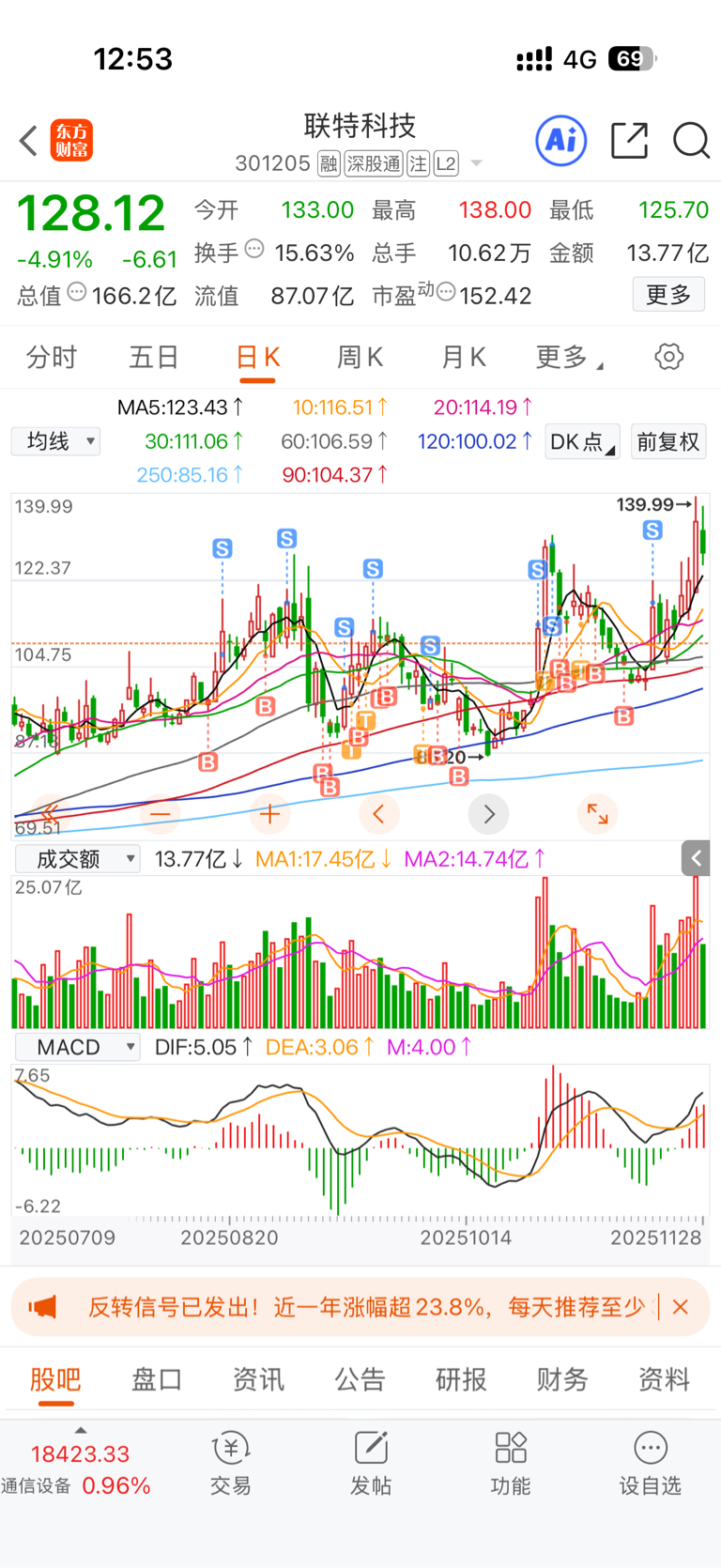 $联特科技(SZ301205)$ 97.5开始买入的,后面一直做T,盈利大概60个点吧,最近开始没再做t了,感觉越来越难了,现在还拿着完全是信念,相信人工智能刚开始,不管是谷歌还是英伟达都是需要光模块的,为信仰买单