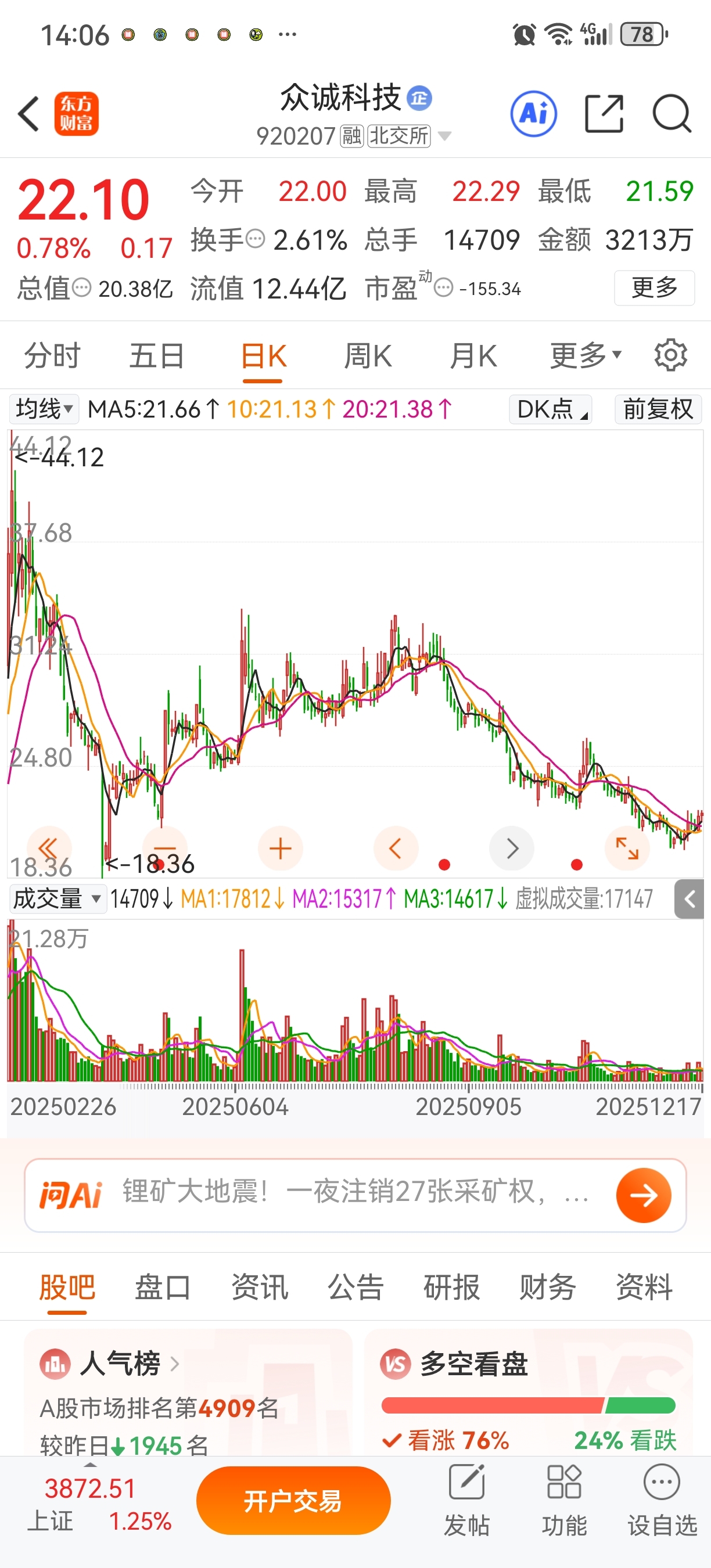 众诚科技,从44元多跌到22元本周即将大涨停建仓