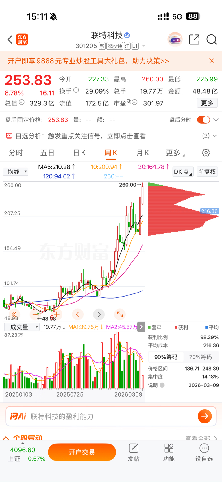 $联特科技(SZ301205)$ 周K,起涨点48.98,一浪高点127.97,涨幅79。二浪低点86.2,回调41.77。三浪高点229.9,涨幅143.7。四浪低点178.24,回撤51.66。