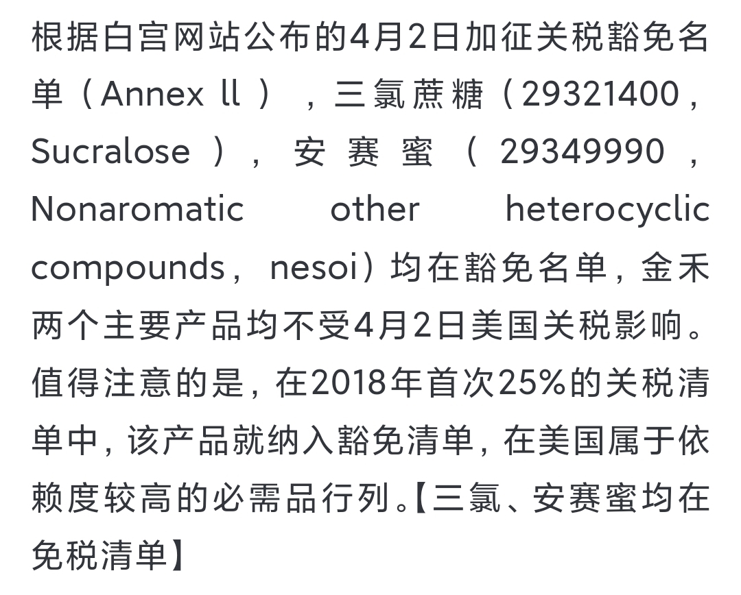 金禾实业:三氯蔗糖和安赛蜜长期均在加征关税豁免名单中