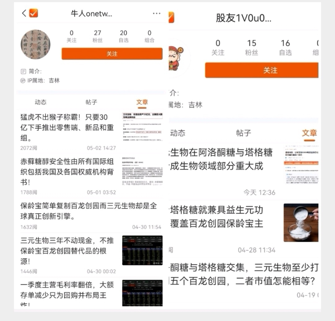 $三元生物(SZ301206)$ 严查网络黑嘴,大家举报这两个一直在刷屏诋毁我们股票的蟑螂。这两个吉林股托的目的是忽悠人抛保龄宝,百龙创园去接盘爆雷的三元生物,帮三元生物二股东清仓。$保龄宝(SZ002286)$ $百龙创园(SH605016)$
