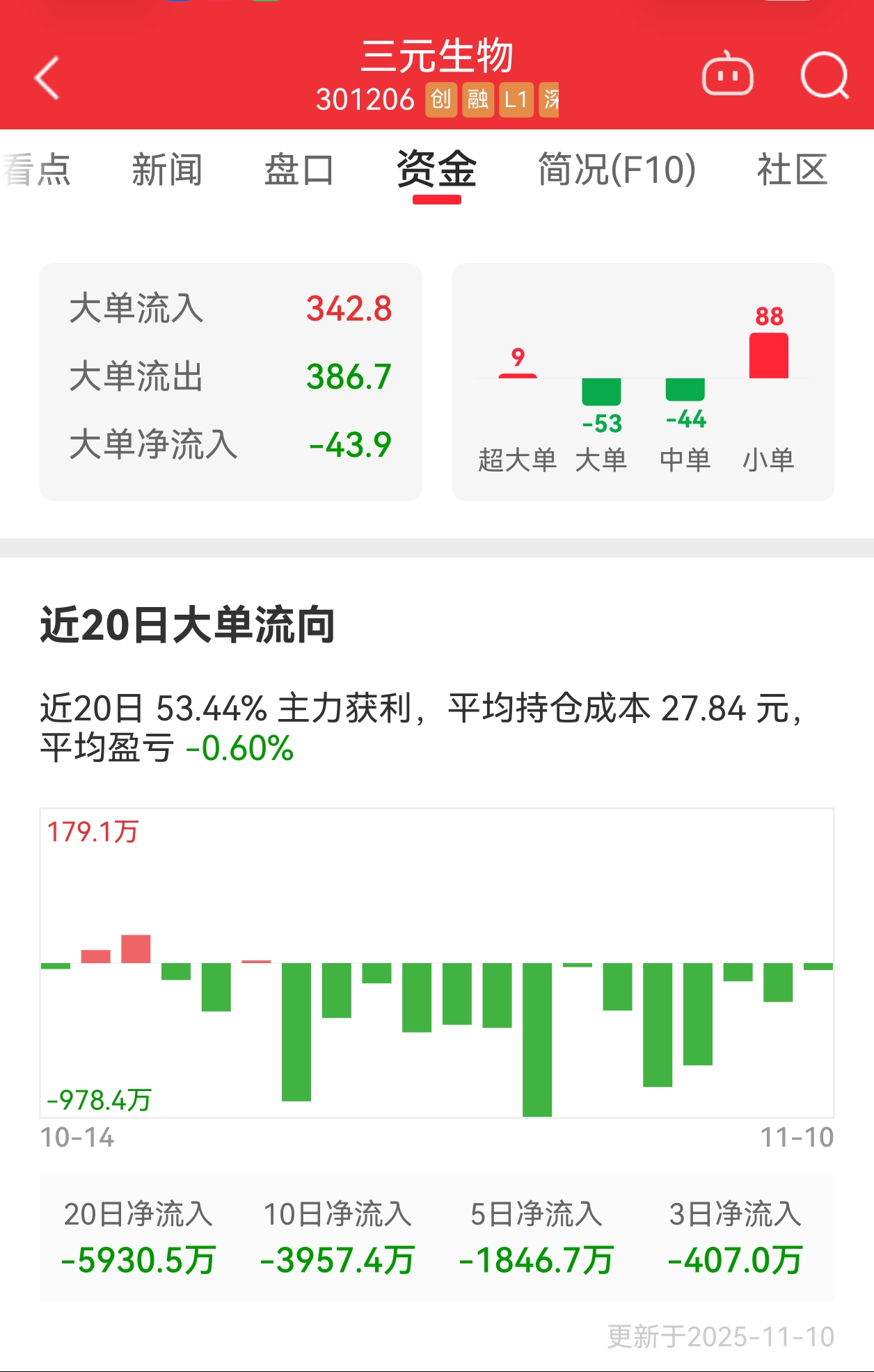 $三元生物(SZ301206)$ 大资金每天都在流出,都让散户接盘了