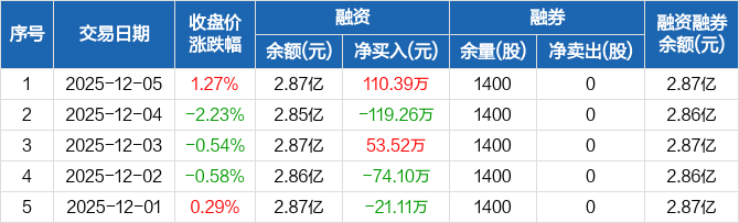 融资方面,当日融资买入387.17万元,融资偿还276.78万元,融资净买入110.39万元。融券方面,融券卖出0股,融券偿还0股,融券余量1400股,融券余额3.8万元。融资融券余额合计2.87亿元。