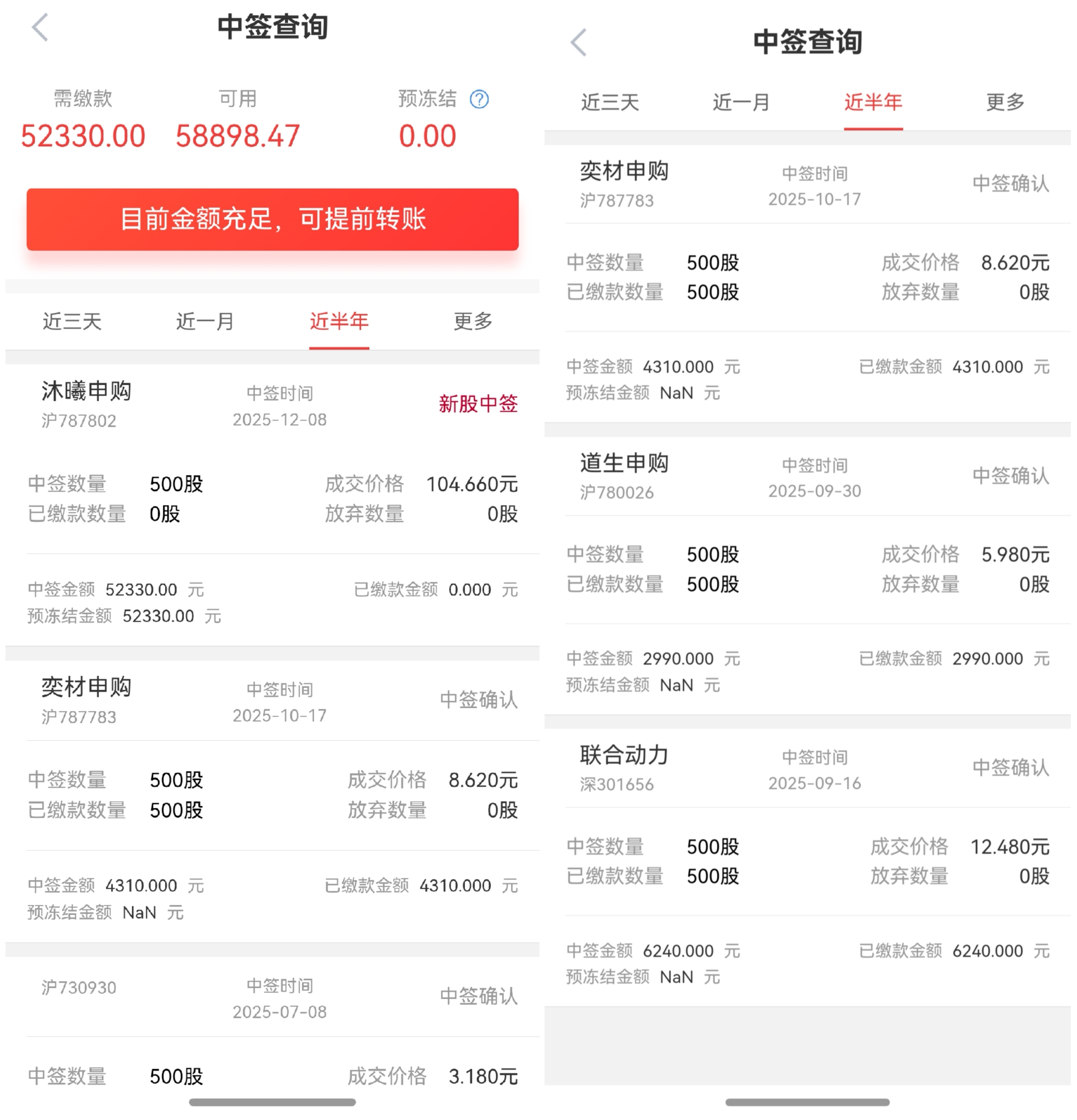 中了个百元新股,三个账号打新股其中两个账号最近几个月一共中了6个新股