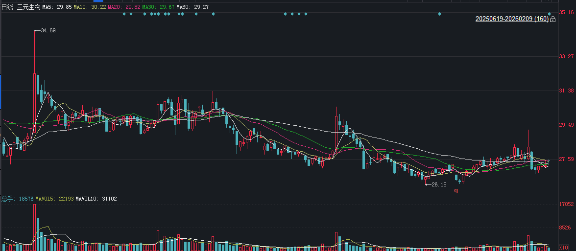二级市场上,截至2月9日收盘,三元生物上涨0.84%报27.45元/股,总市值约55.54亿元,近一年来公司股价累计上涨约12%。