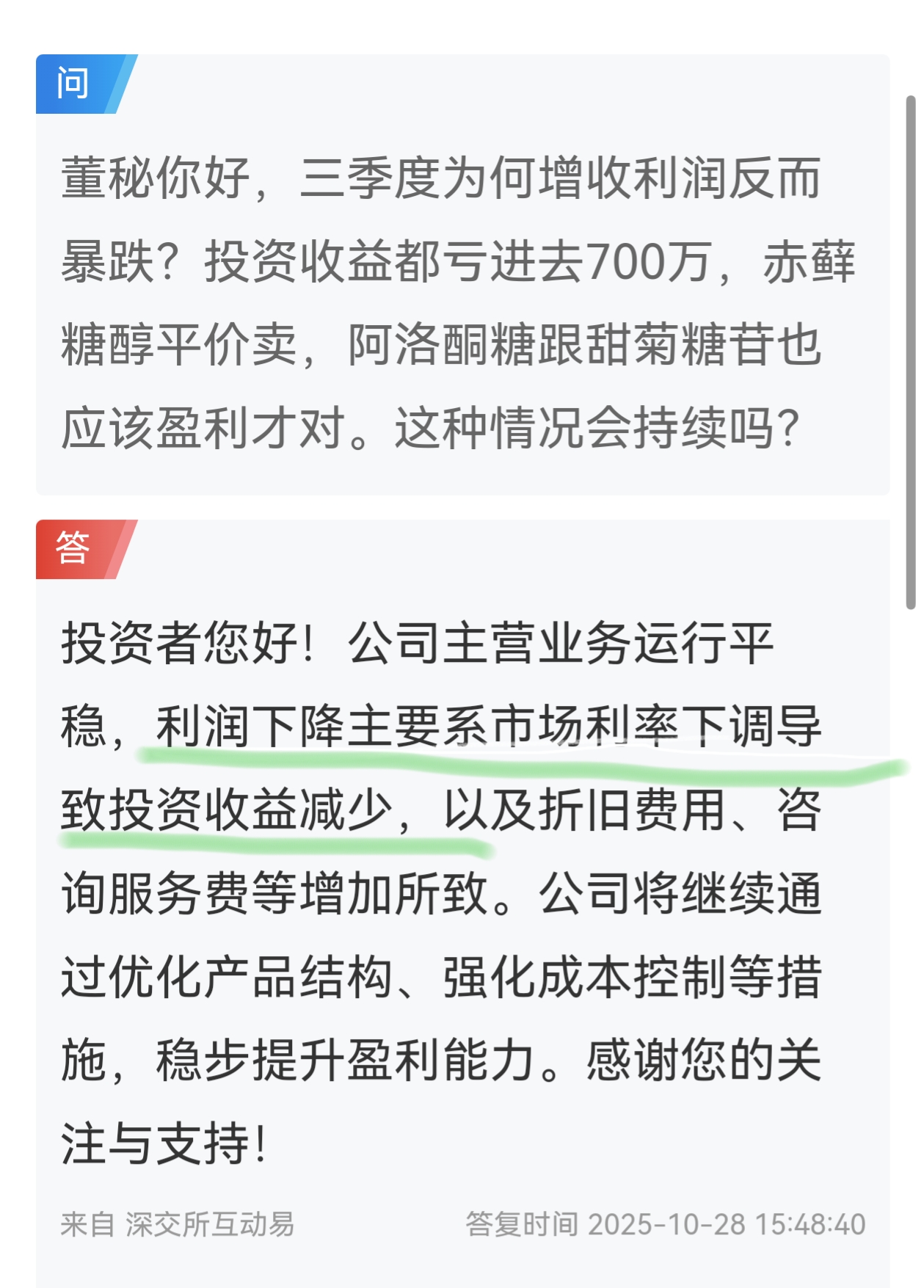 $三元生物(SZ301206)$ 看看这公告是上市公司应该说的吗,利润下滑是因为银行理财收益下降
