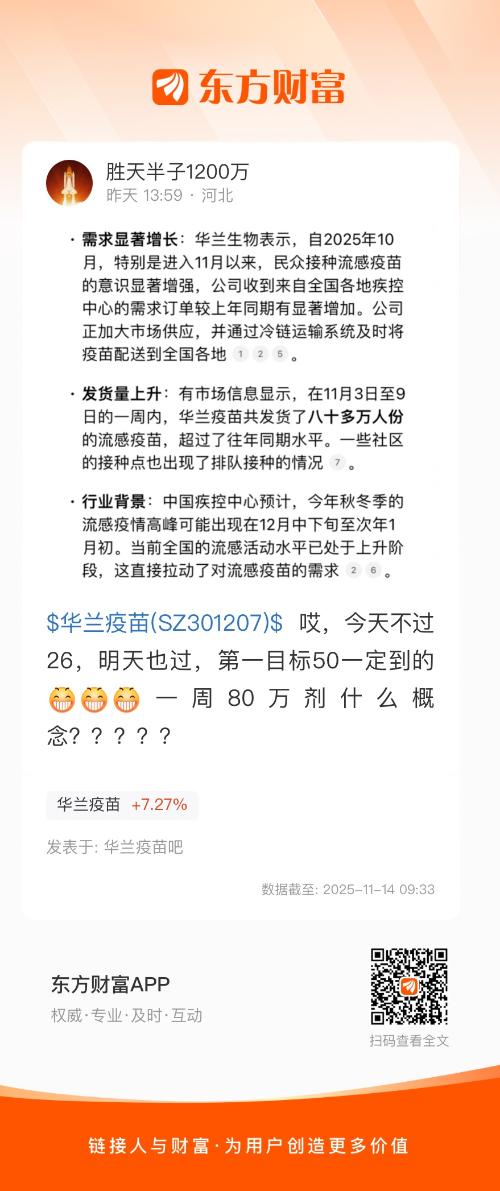 $华兰疫苗(SZ301207)$  哎,今天不过26,明天也过,第一目标50一定到的一周80万剂什么概念?????