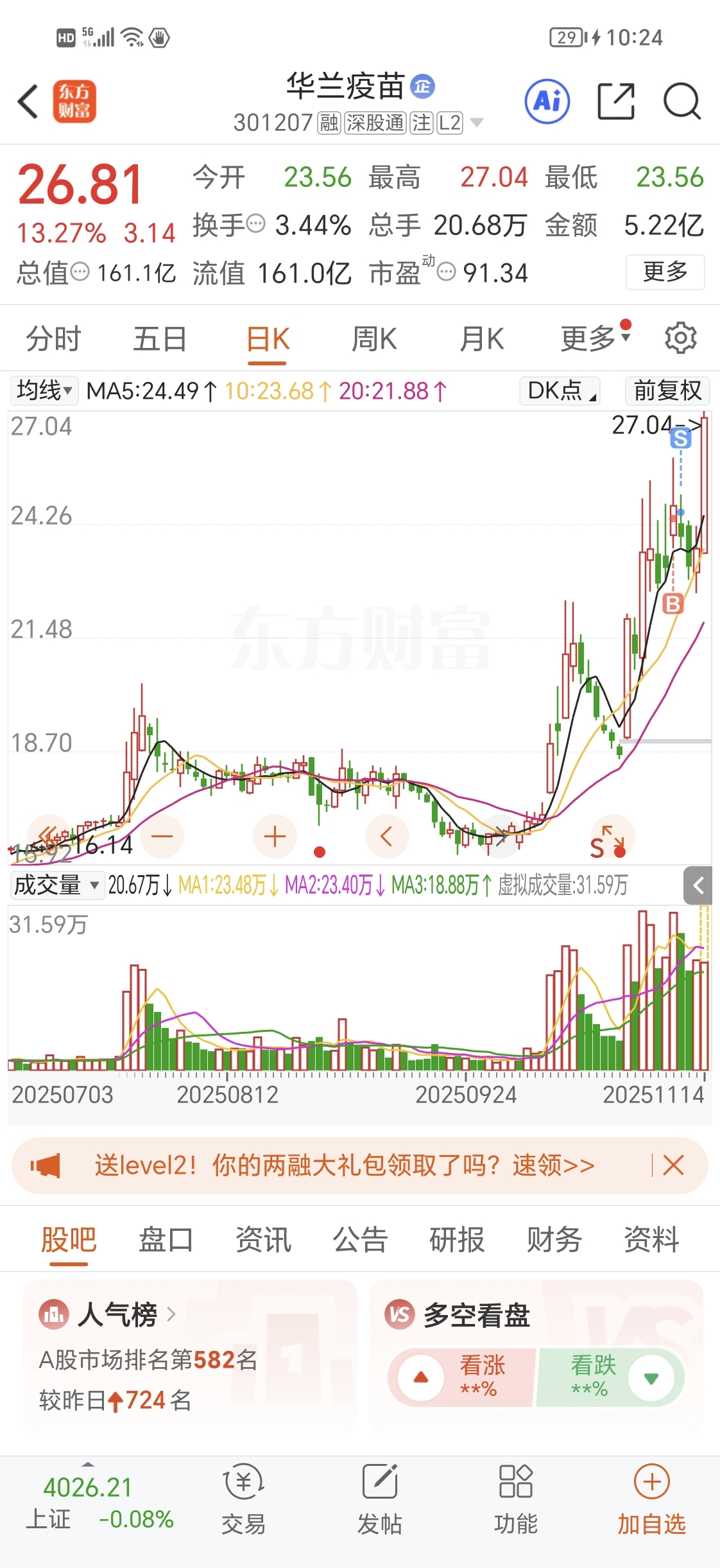 $华兰疫苗(SZ301207)$ 当时我买流感的时候就在想,这个持续很长时间,最好多拿几天,结果第二天就大跌4个点,我真的受不了刚刚重仓隔天立刻就大跌。总感觉被针对了。一天比一天离谱,前几天丰元我卖了两秒就大涨。今天我重仓的票早盘几秒钟就冲高到3个点,结果现在负二。人家的票都是低开高走,我的票高开低走今天。亏的我心灰意冷,想销户了。真的不想玩了。卖了的都大涨,格局的都跌