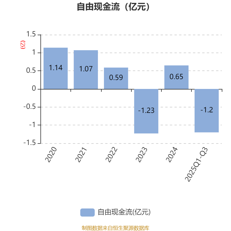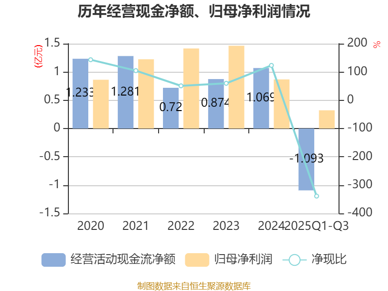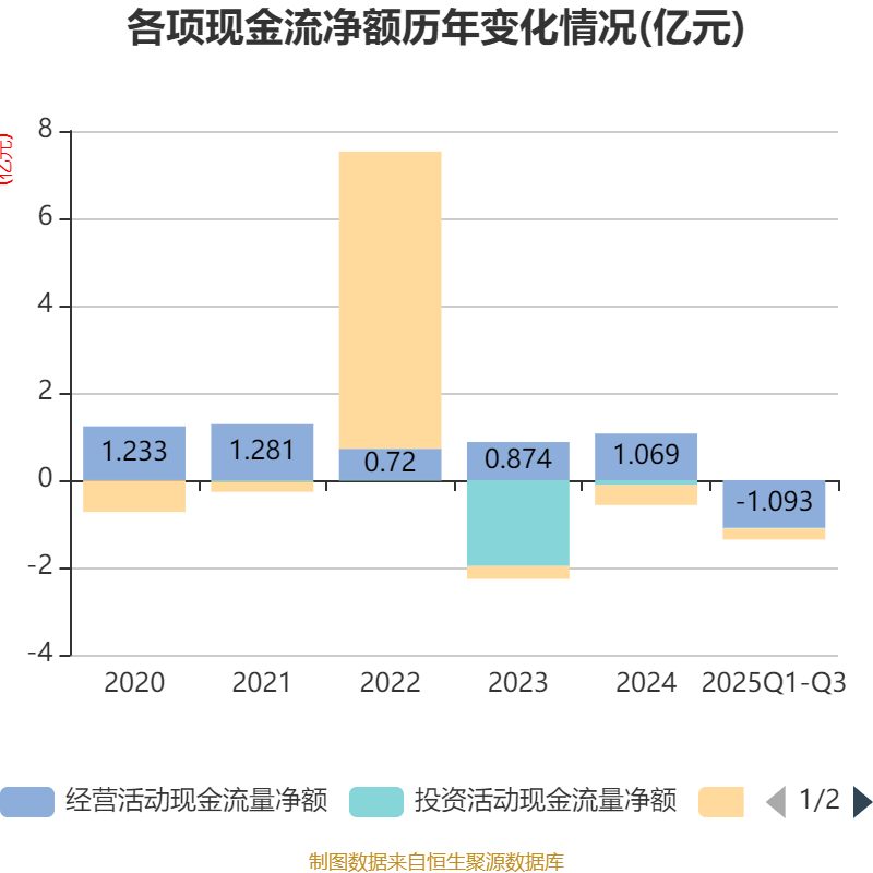 2025年前三季度,公司经营活动现金流净额为-1.09亿元,同比增加1.04亿元;筹资活动现金流净额-2532.02万元,同比增加1514.31万元;投资活动现金流净额-138.45万元,上年同期为-996.77万元。