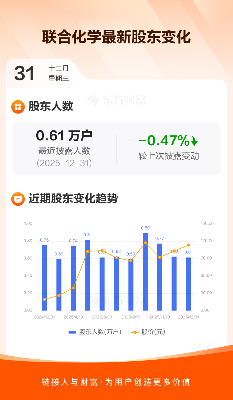 联合化学最新披露数据显示,截至12月31日公司股东户数为6123户,较上期(2025年12月19日)减少29户,降幅为0.47%。户均持有流通股数量为1.56万股,与上期基本持平,户均持股金额由上期的159.89万元增加至176.41万元。